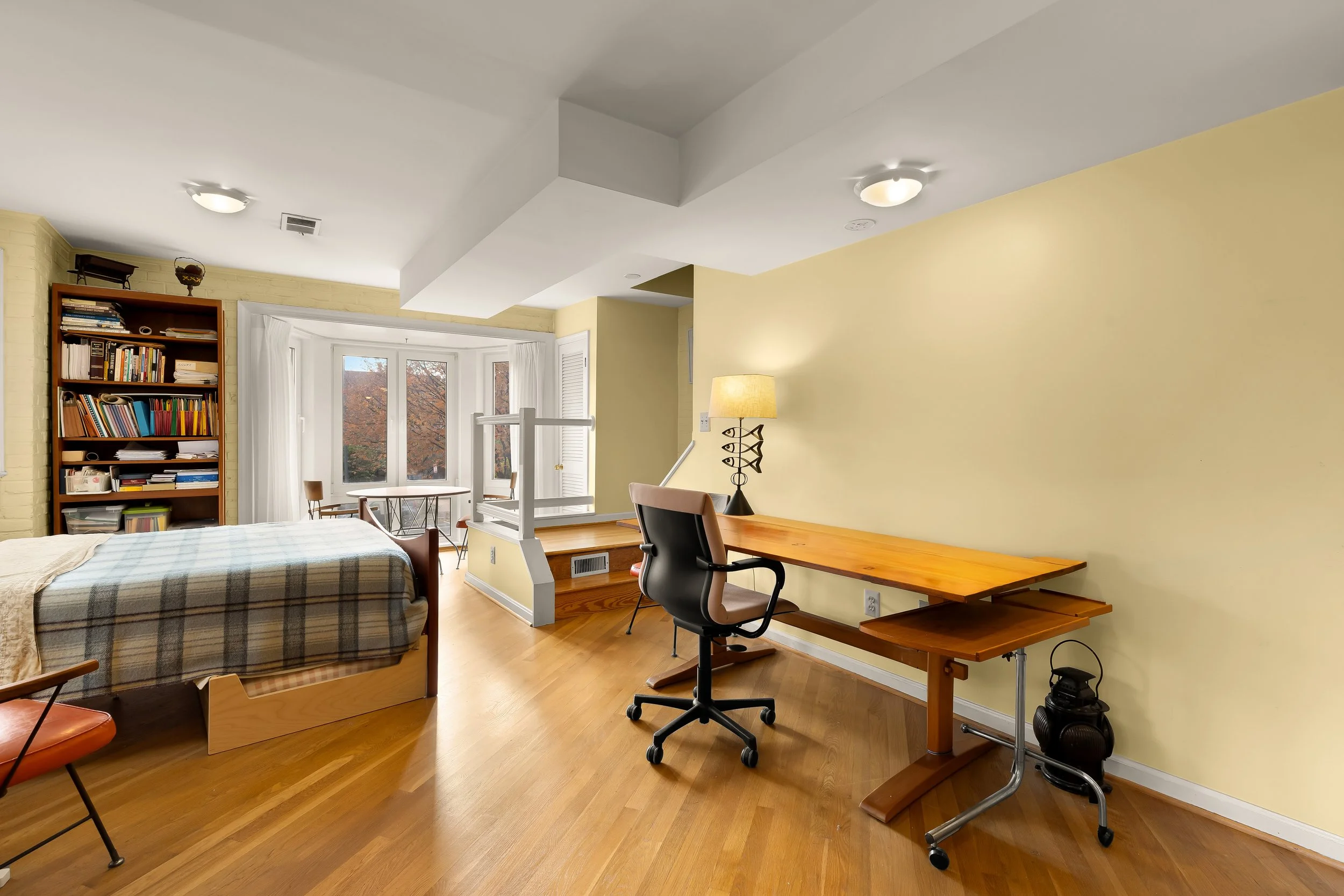 Upstairs, the primary suite includes a wood-burning fireplace, a Murano glass chandelier from the 1960s, and full-height louvered doors in the walk-in closet. The adjoining bedrooms feature original Aesthetic Period ceiling medallions, preserved millwork, and access to the connecting breezeway. A later renovation added a bright rear bay overlooking North Carolina Avenue and Lincoln Park, introducing a level of flexible space that is exceptionally rare for the neighborhood.