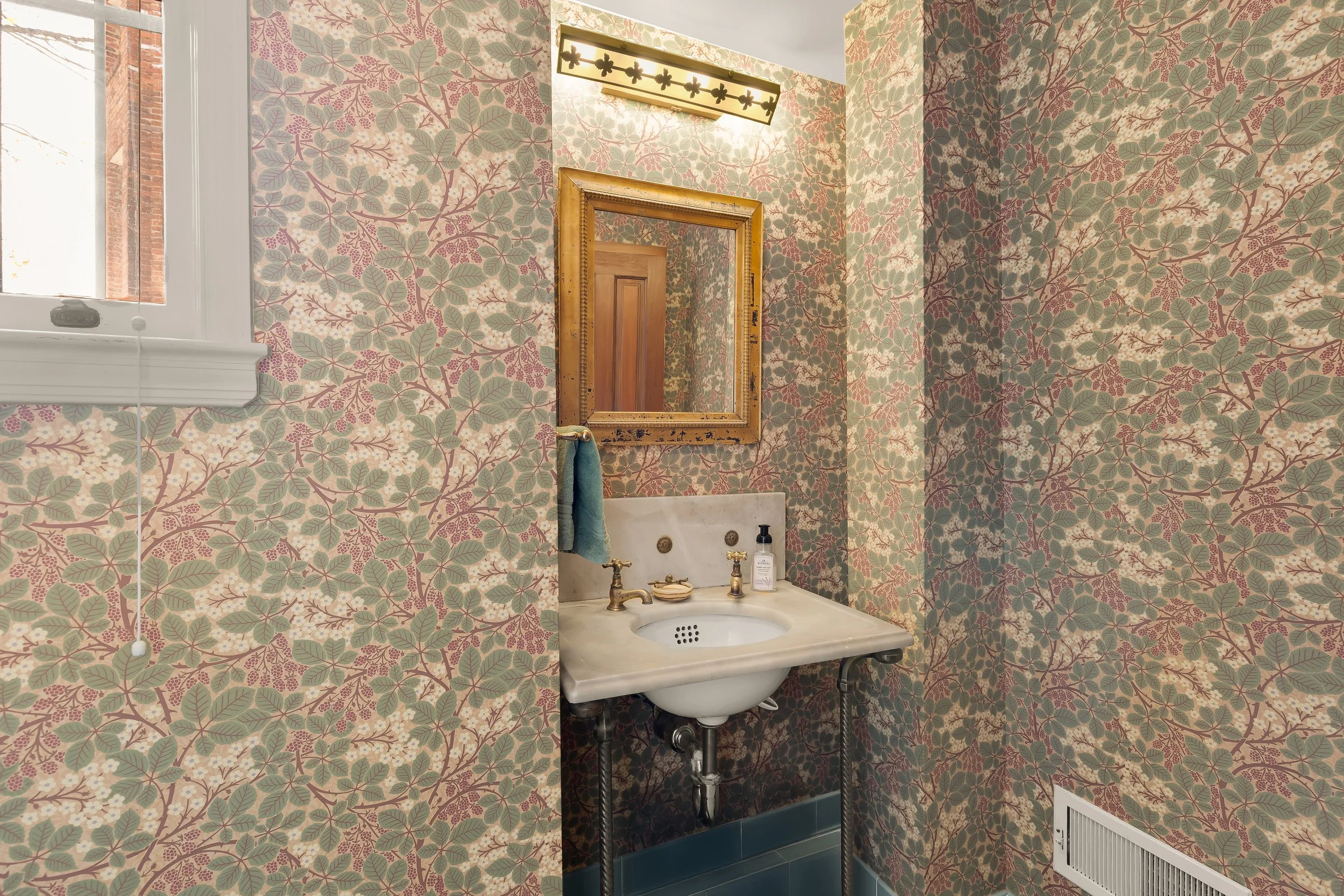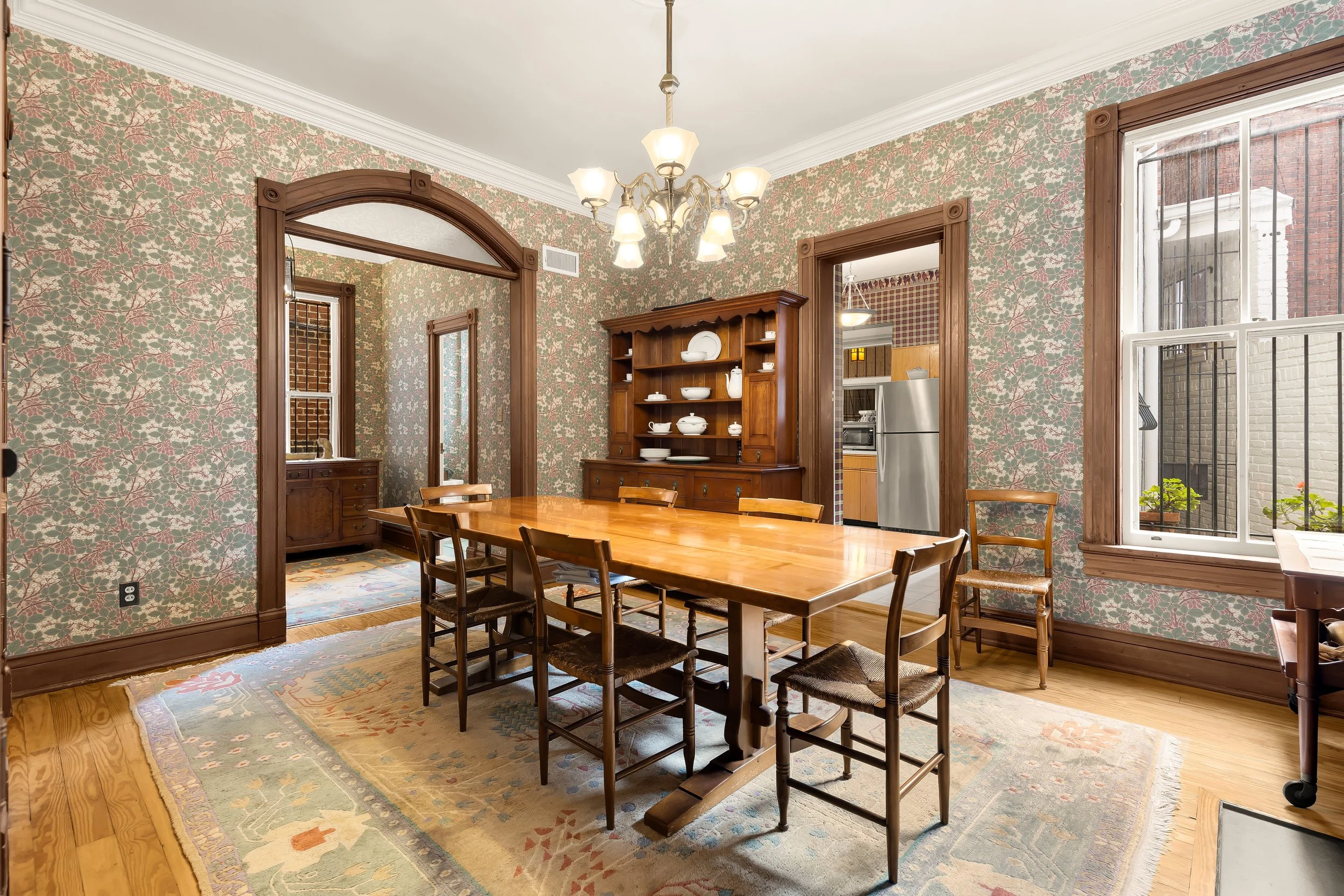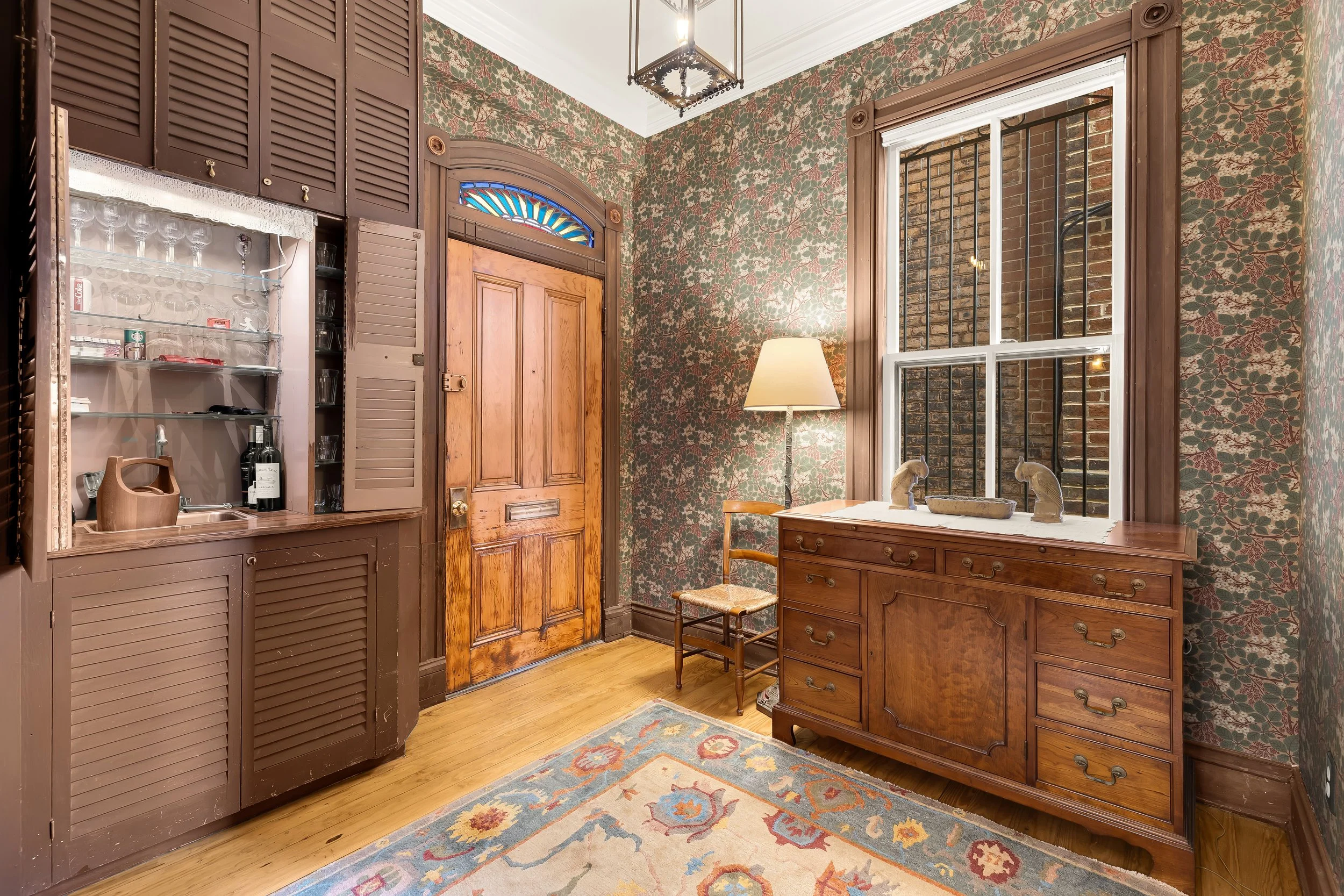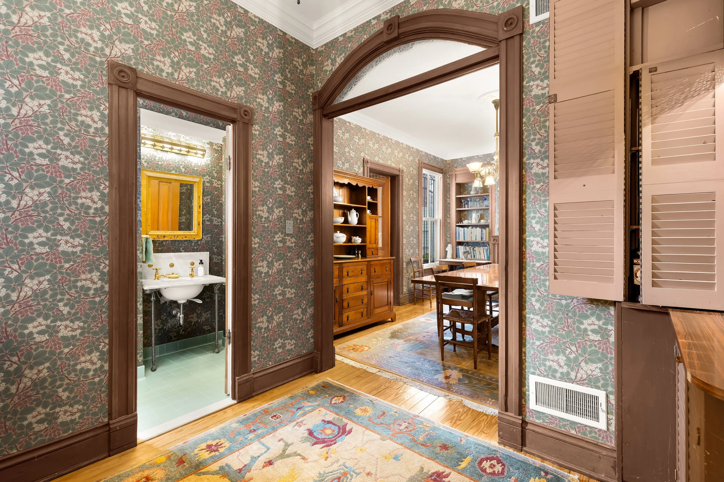 The main level features original pine floors and chestnut paneling, introduced by a vestibule topped with a stained-glass clerestory window. The dual-parlor living room includes a wood-burning fireplace, while the dining room showcases William Morris wallpaper reproduced by Bradbury & Bradbury and original glass-front built-ins. A wet bar, powder room, and a kitchen with access to the outdoor spaces complete this level.